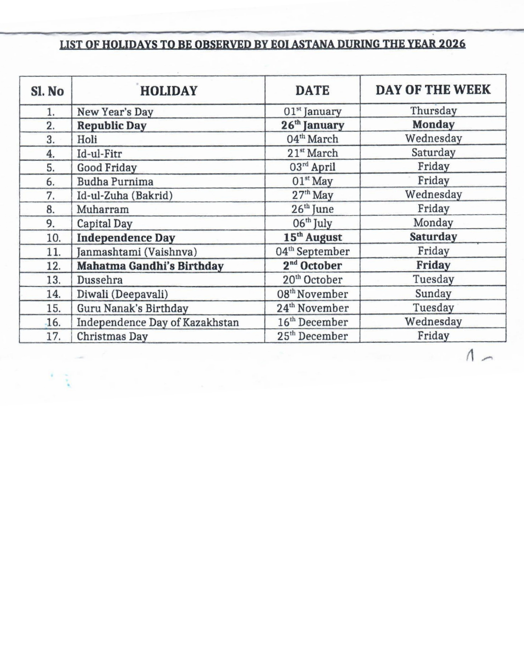 List of Holidays